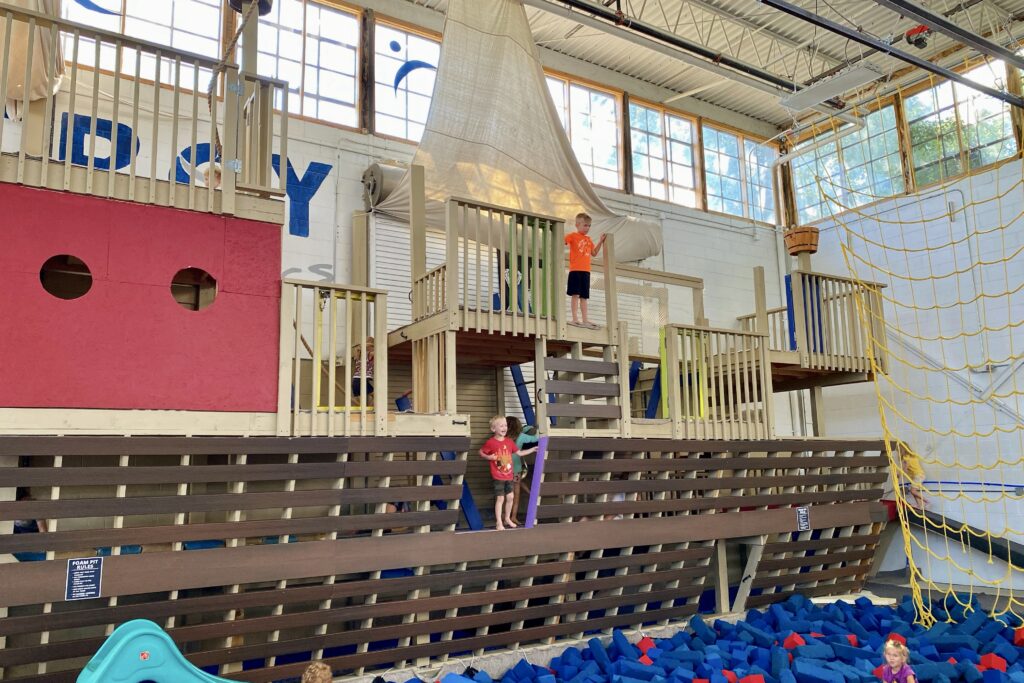 242 Church in Ann Arbor has an amazing open to the public playscape, cafe, and open turf area! The climbing area has three slides for different levels of climbers. Test their strength and see if they can make it to the top! There is also a toddler area with two slides, a tunnel, and a hill. All covered in soft turf perfect for crawlers. In the center, is a sunk in area perfect for babies. Bring a few toys from home and watch them explore the new space.