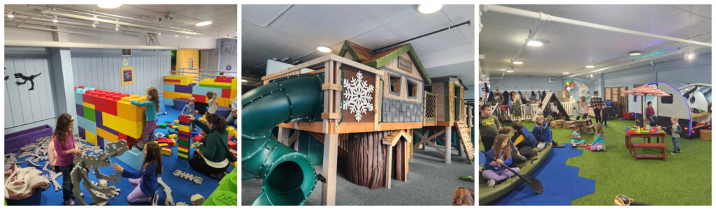 They also host a inside play structure. Dedicated under two area filled with age appropriate toys. Sensory area, giant water table, Lego area, and did someone say dinosaurs? You can design your own out of bones! There is also a pretend camping area complete with a ranger station, kayak, teepees, and pretend campfire! Pack a lunch and eat in their designated lunch area to make the day last longer.